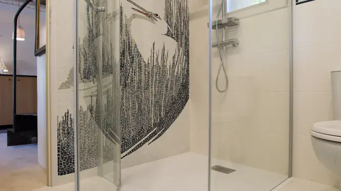 On the ground floor, the living room opens onto a kitchen area and bathroom decorated with mosaics on the floor and shower!