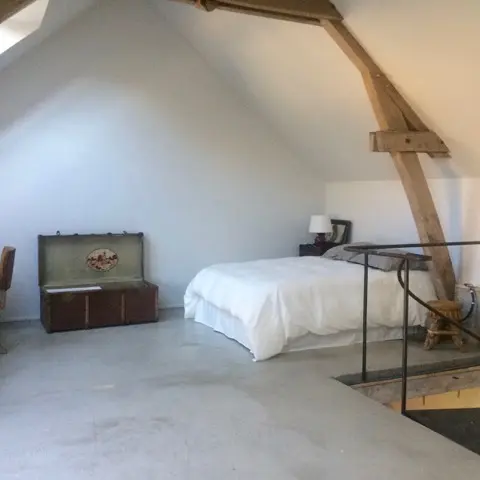 Upstairs, a charming bedroom space in a vast workshop lit by glass roofs.